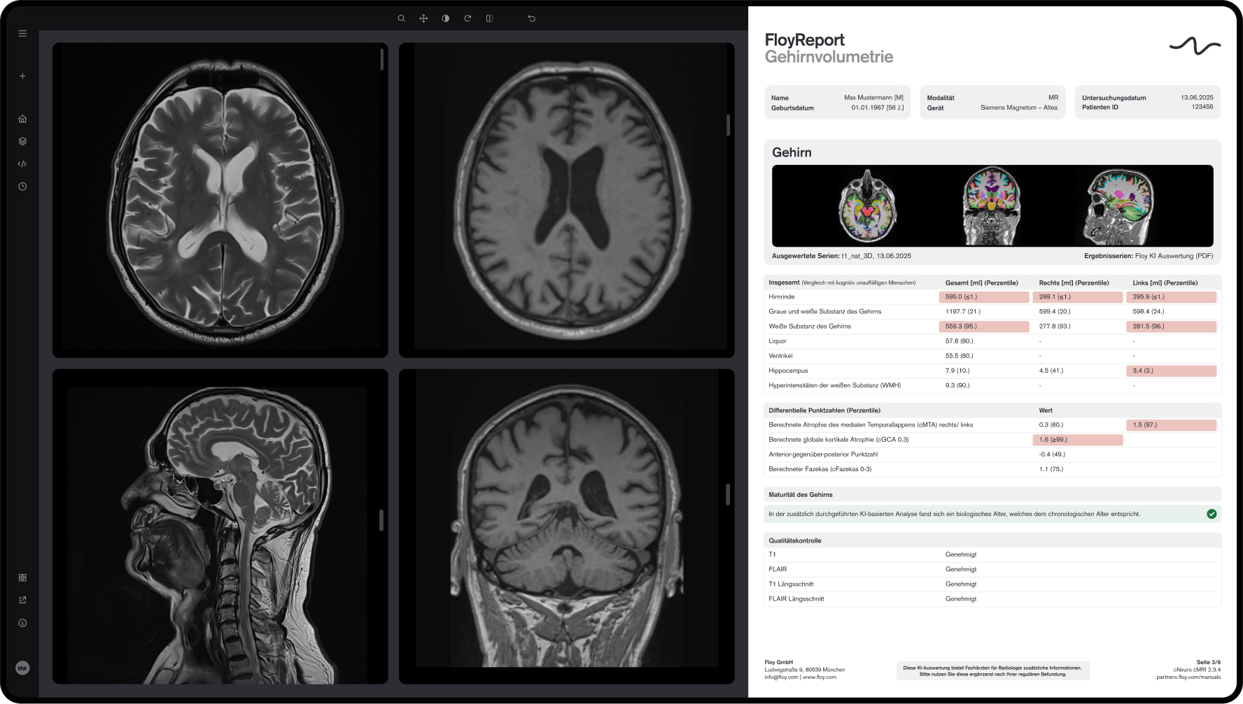 Floy® vermisst präzise und vollautomatisch das Volumen der Gehirnareale im MRT im Abgleich mit alters- und geschlechtsspezifischen Normkohorten, um neurodegenerative Erkrankungen wie Demenzformen frühzeitig diagnostizieren zu können.