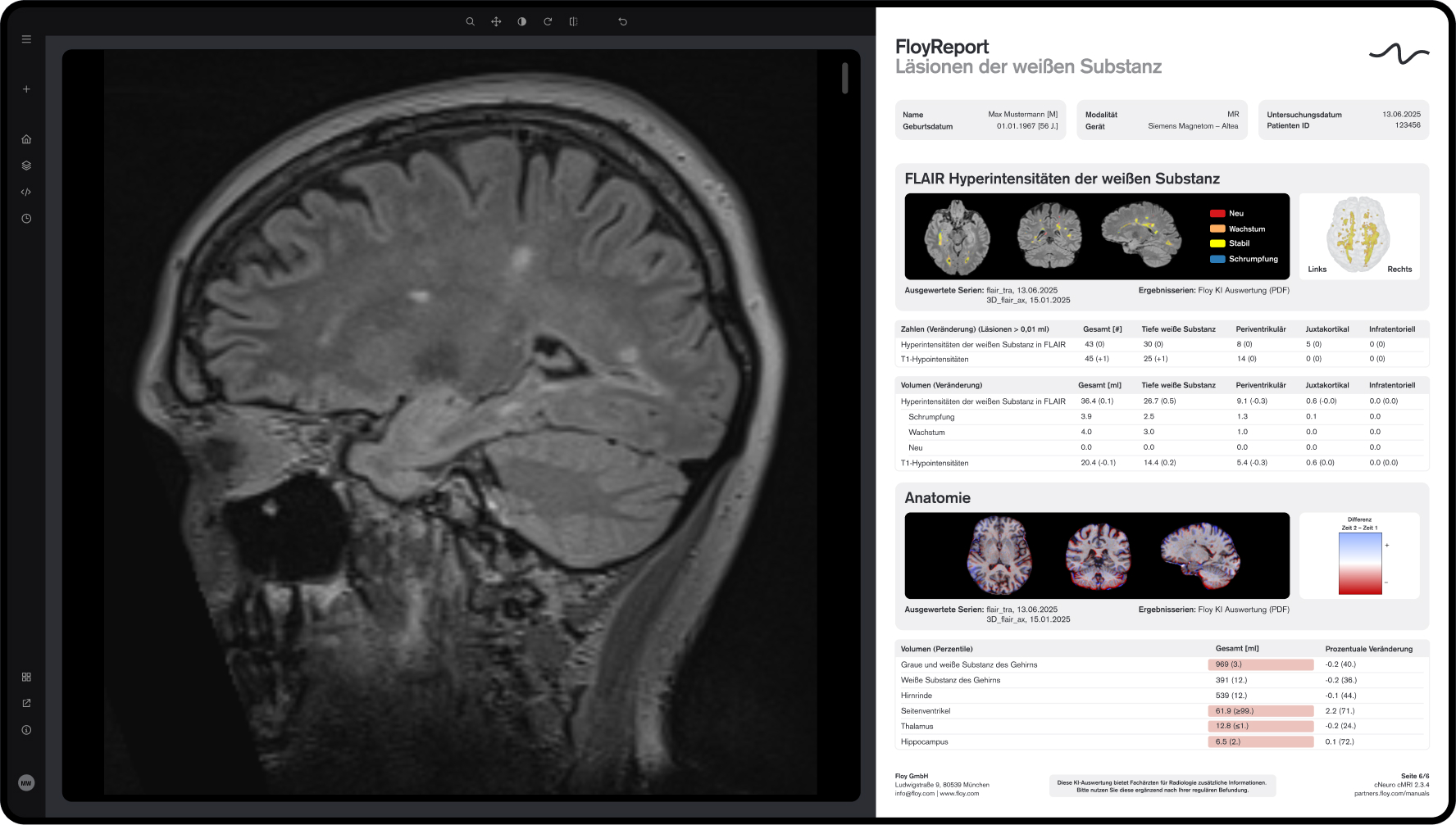 Floy® erkennt und vermisst Multiple-Sklerose-Läsionen in Gehirn MRTs vollautomatisch, auch im Abgleich mit Voruntersuchungen, um eine präzise Multiple-Sklerose-Diagnostik zu unterstützen.
