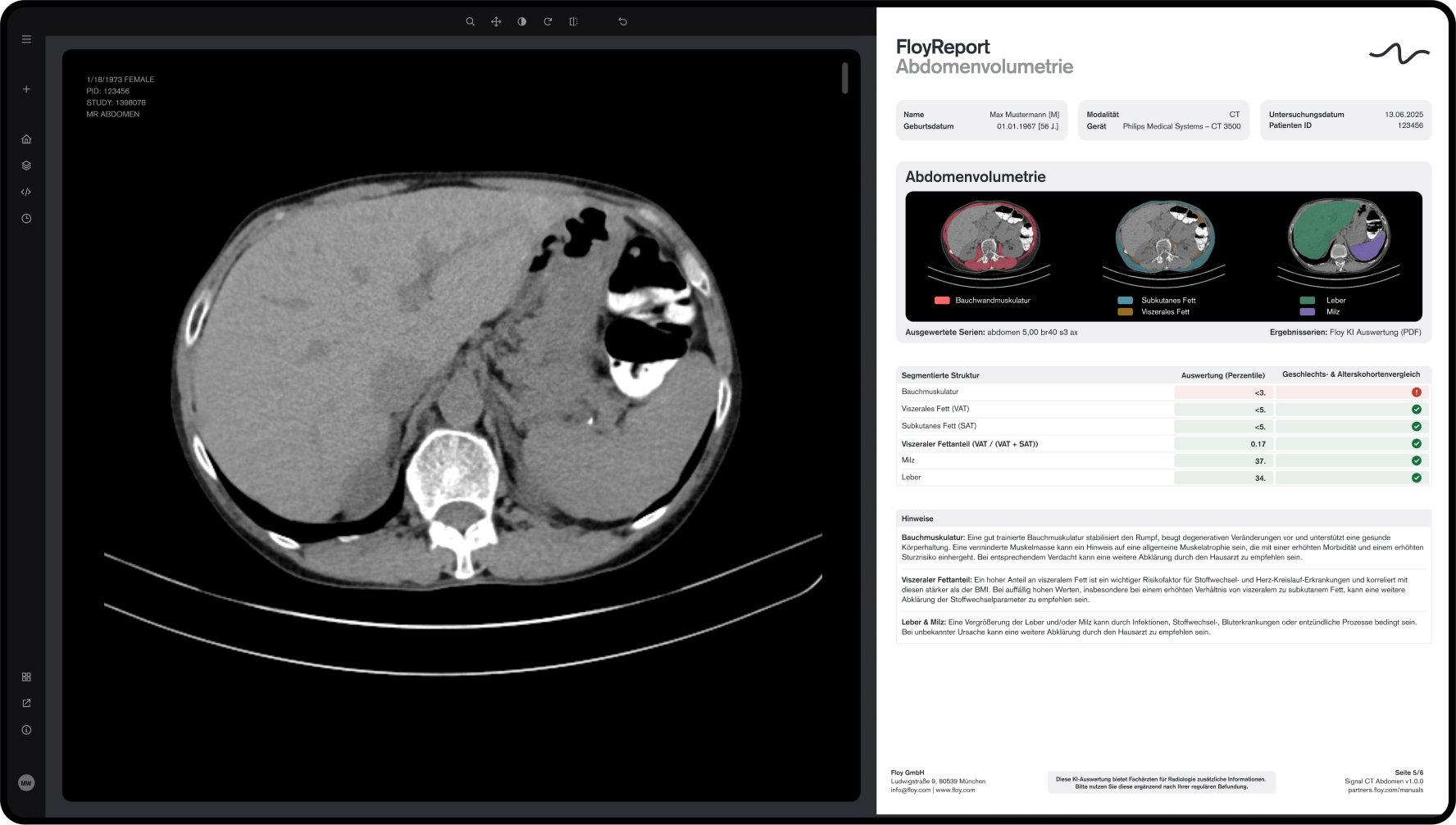 Floy® vermisst präzise und vollautomatisch das Volumen der Organe, Bauchwandmuskulatur sowie des subkutanen und des viszeralen Fettgewebes in Abdomen MRTs und CTs. Hierdurch können frühzeitig Stoffwechselerkrankungen und gesundheitliche Risikofaktoren erkannt werden.